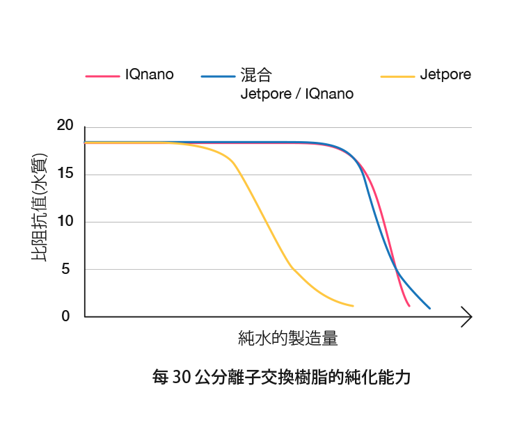 全新研發的IQ-nano離子交換樹脂,擁有更佳的單位體積結合效率,讓耗材體積縮小使用壽命卻不打折,純水機體積也因此可以縮小23%,讓您有限的空間做最大的運用。